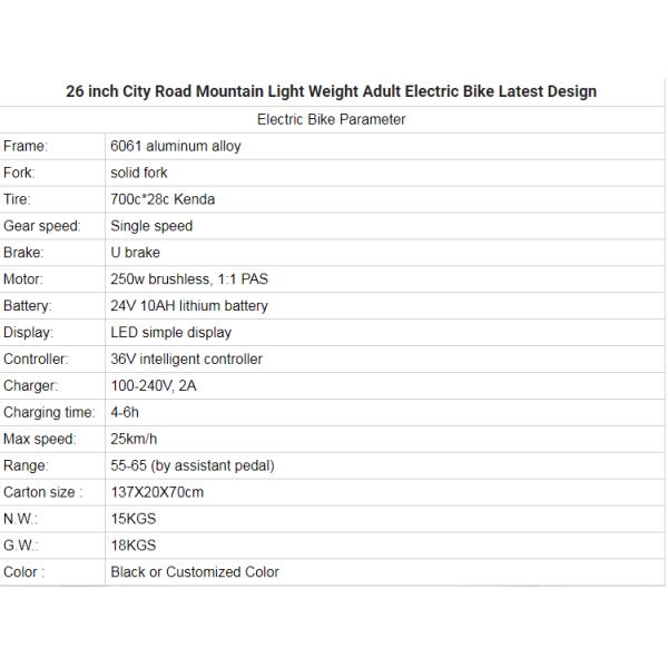 26 Inch Electric City Bicycles Light Weight Adult 250W Images |